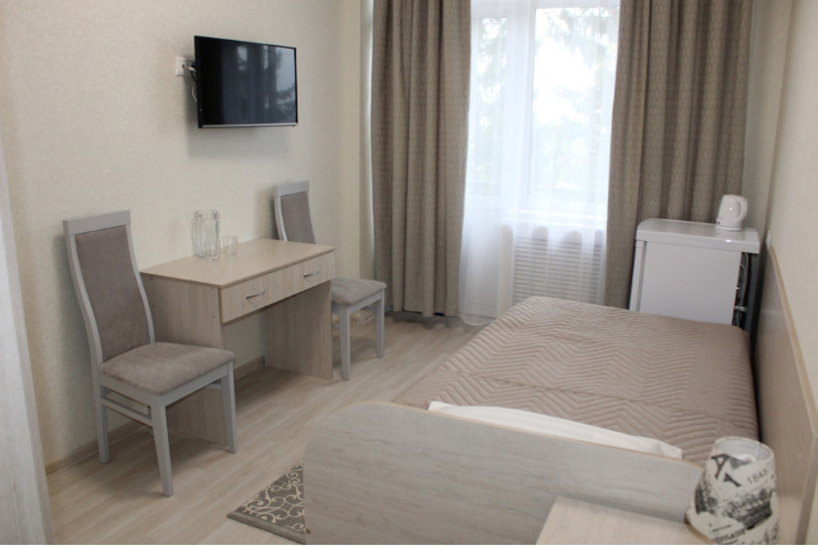 Оснащение номера: две односпальные кровати, прикроватные тумбы, стол, стулья, шкаф для одежды, телевизор, холодильник, электрочайник, бесплатный интернет Wi-Fi